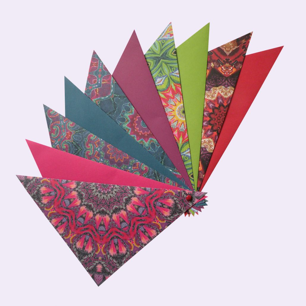 - Idealerweise umweltfreundlich produziertes Papier verwenden. Das von mir gestaltete Kaleidoskop-Papier wird mit Farben auf Pflanzenölbasis bedruckt und ist in vielen verschiedenen Designs und drei Größen erhältlich (10 x 10 cm, 15 x 15 cm und 21 x 21 cm). Es bietet ein besonderes Falterlebnis: bei jedem Faltschritt entstehen neue Muster. Auch einfache Modelle sind damit sehr wirkungsvoll. Erhältlich in meinem Onlineshop: http://www.papierdesign.at/origami-shop